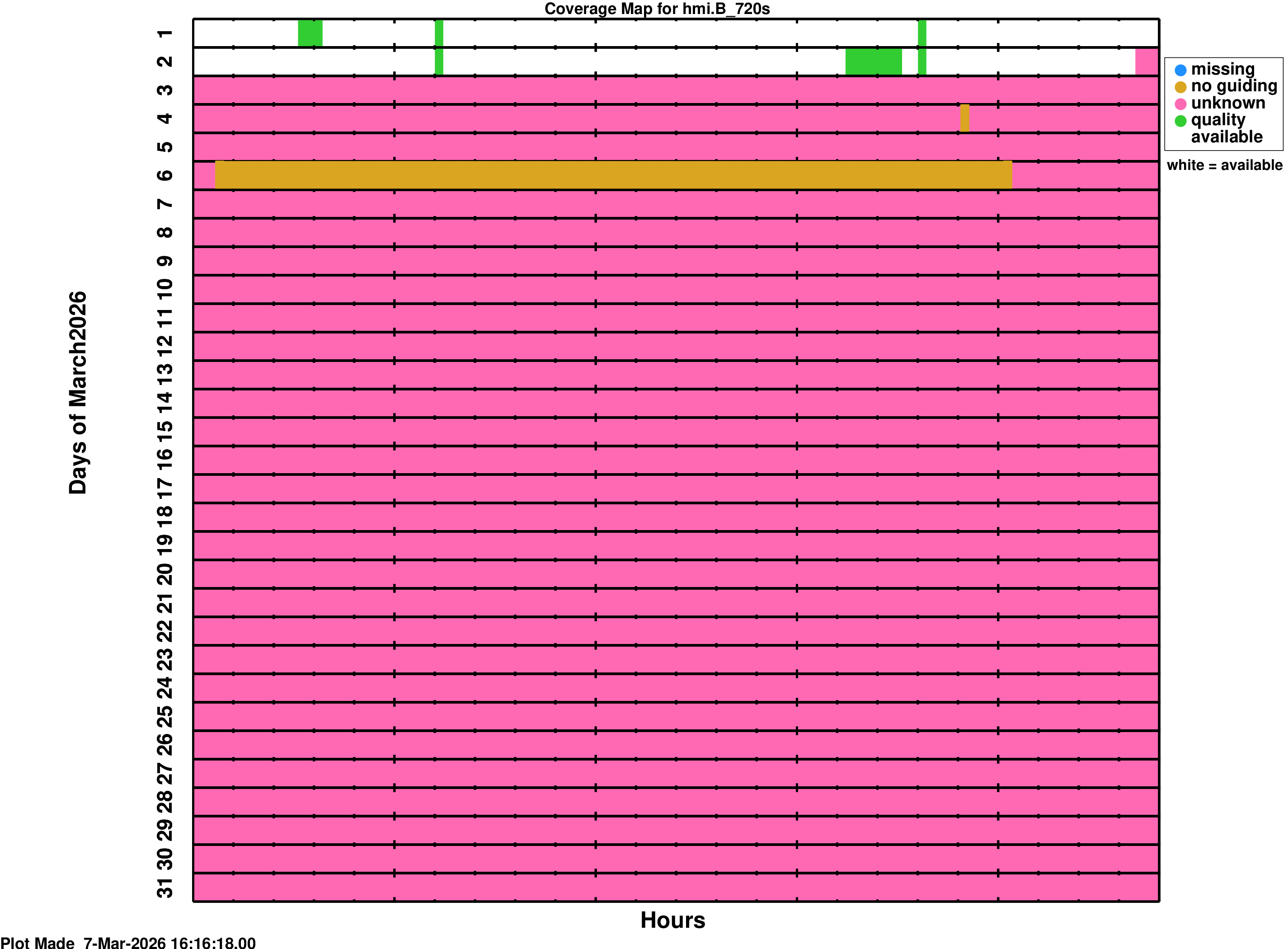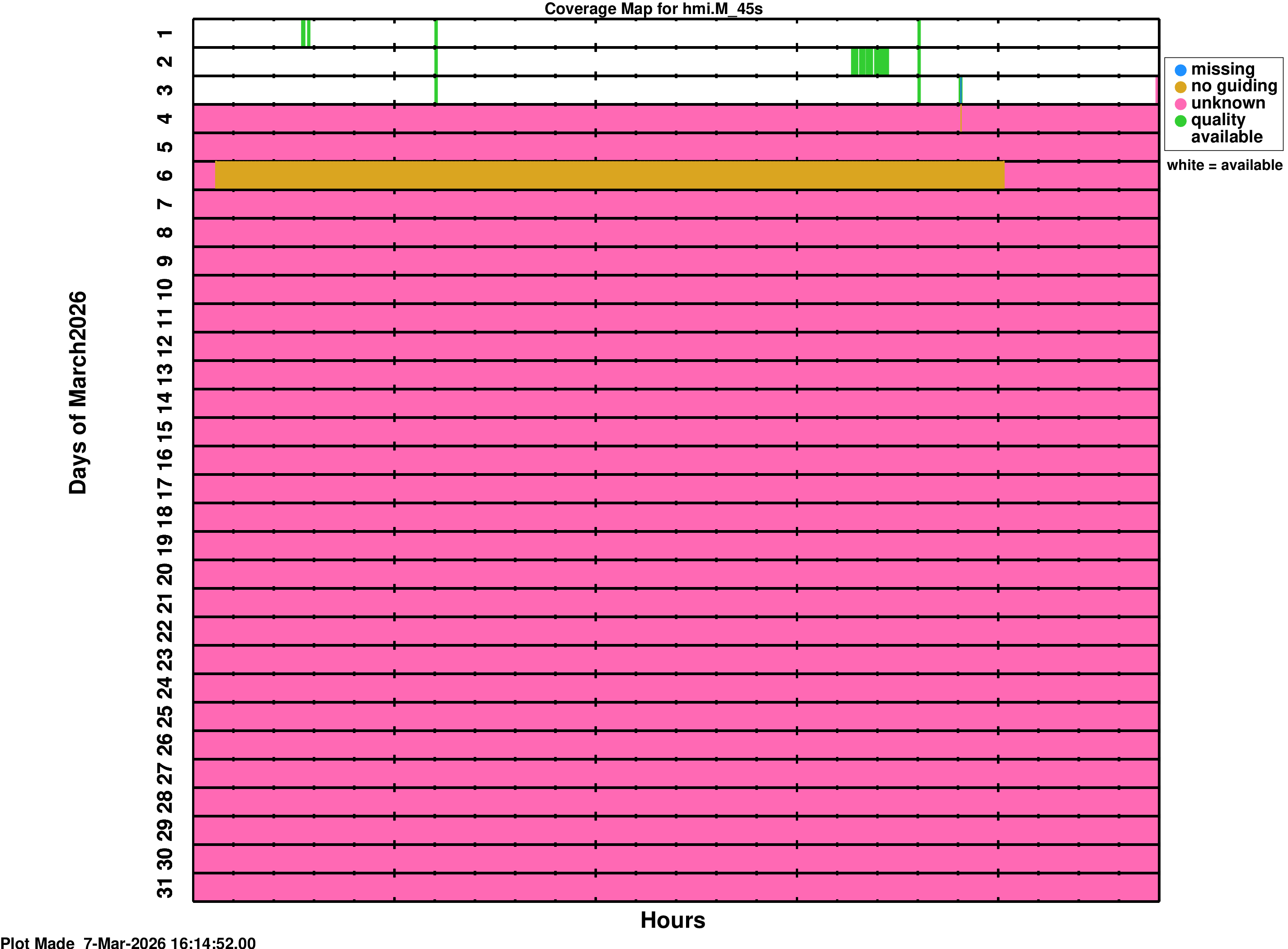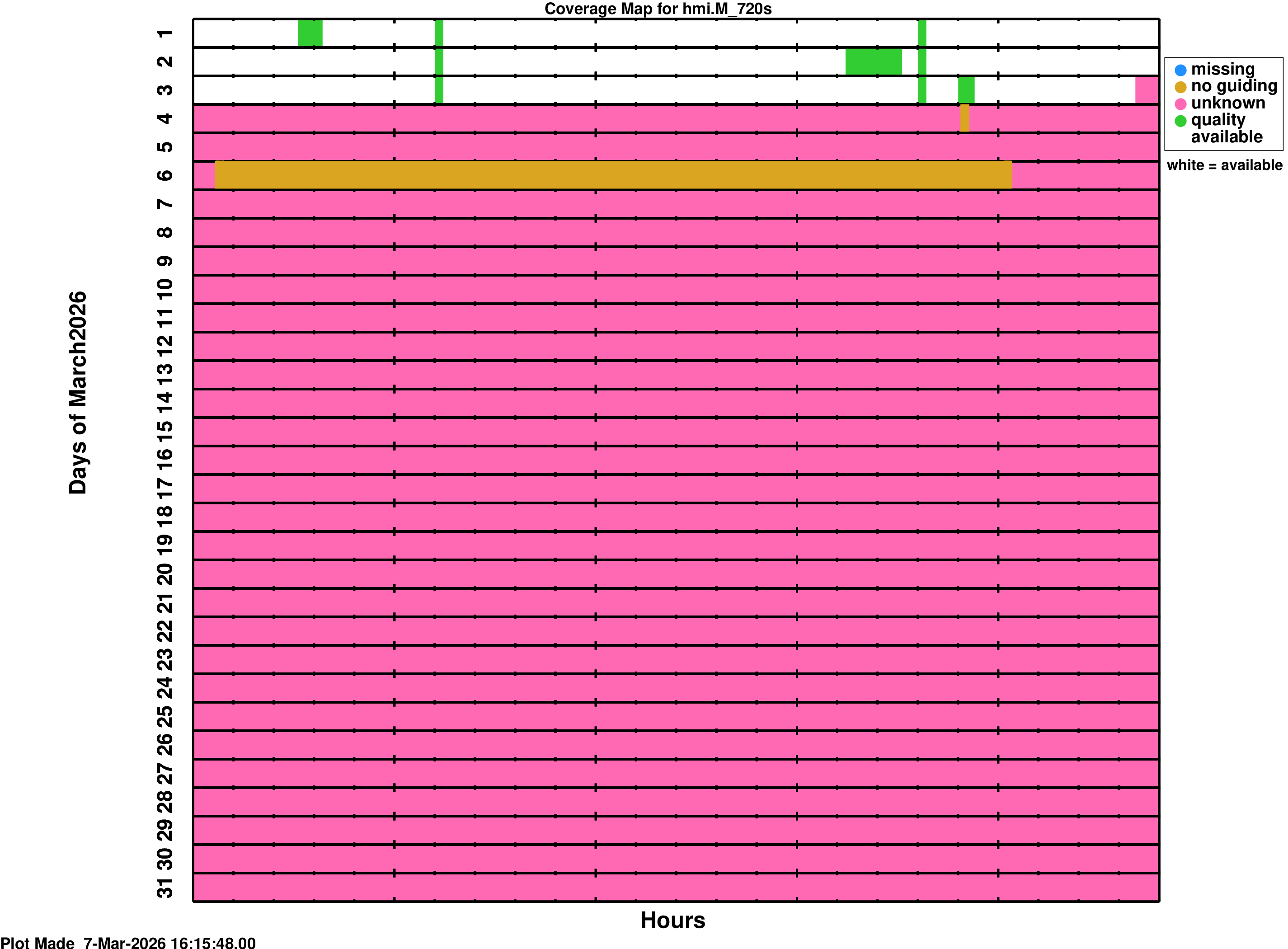 YYYY_MM_map.png is a coverage map for the series hmi.V_45s YYYY_MM_map_m.png is a coverage map for the series hmi.M_45s YYYY_MM_map_s720.png is a coverage map for the series hmi.S_720s YYYY_MM_map_m720.png is a coverage map for the series hmi.M_720sWhite spaces on the coverage maps indicate time where data is ready for use. The colors on the coverage map indicate times where the data product is not available or has some QUALITY bits set. Colors mean: