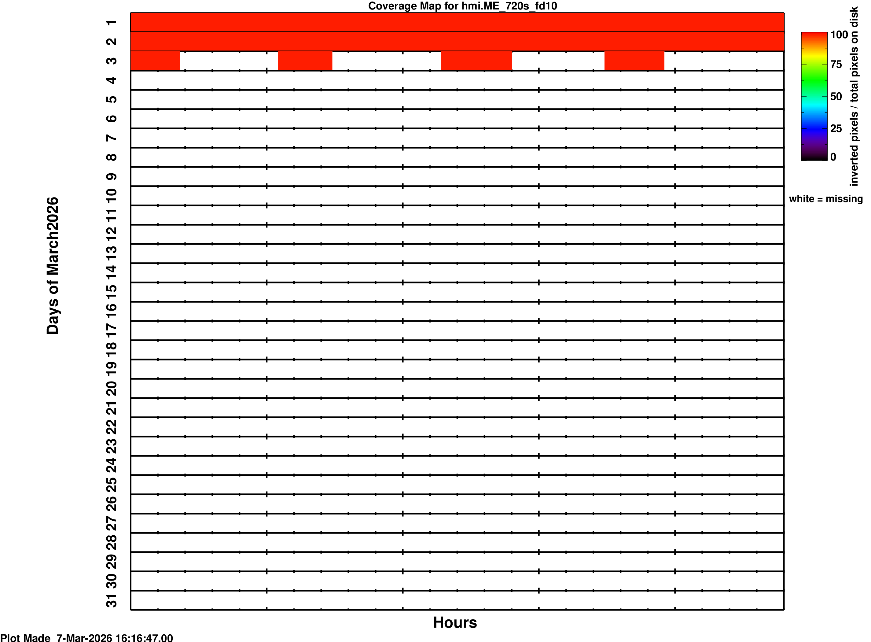 YYYY_MM_fd10_nrt.png is a coverage map for the series hmi.ME_720s_fd10_nrt YYYY_MM_fd_fd10.png is a coverage map for the series hmi.ME_72s_fd10The coverage maps in the /fd10 series are a montage of two maps: The left map shows coverage for hmi.S_720s and follows the color schemes outlined above. For the right map, colored spaces indicate times when inverted data is present; the color of the data correspond to the value of (INVNPROC) / ( PI*(RSUN_OBS*(1/CDELT1))^2 ), or (the number of inverted pixels)/(total number of pixels within the solar radius). Values greater than 1 are truncated to 1. The keywords RSUN_OBS and CDELT1 are obtained from the appropriate time in the hmi.S_720s data. White spaces indicate times where the stokes data are available but the inversion module has not yet been run.