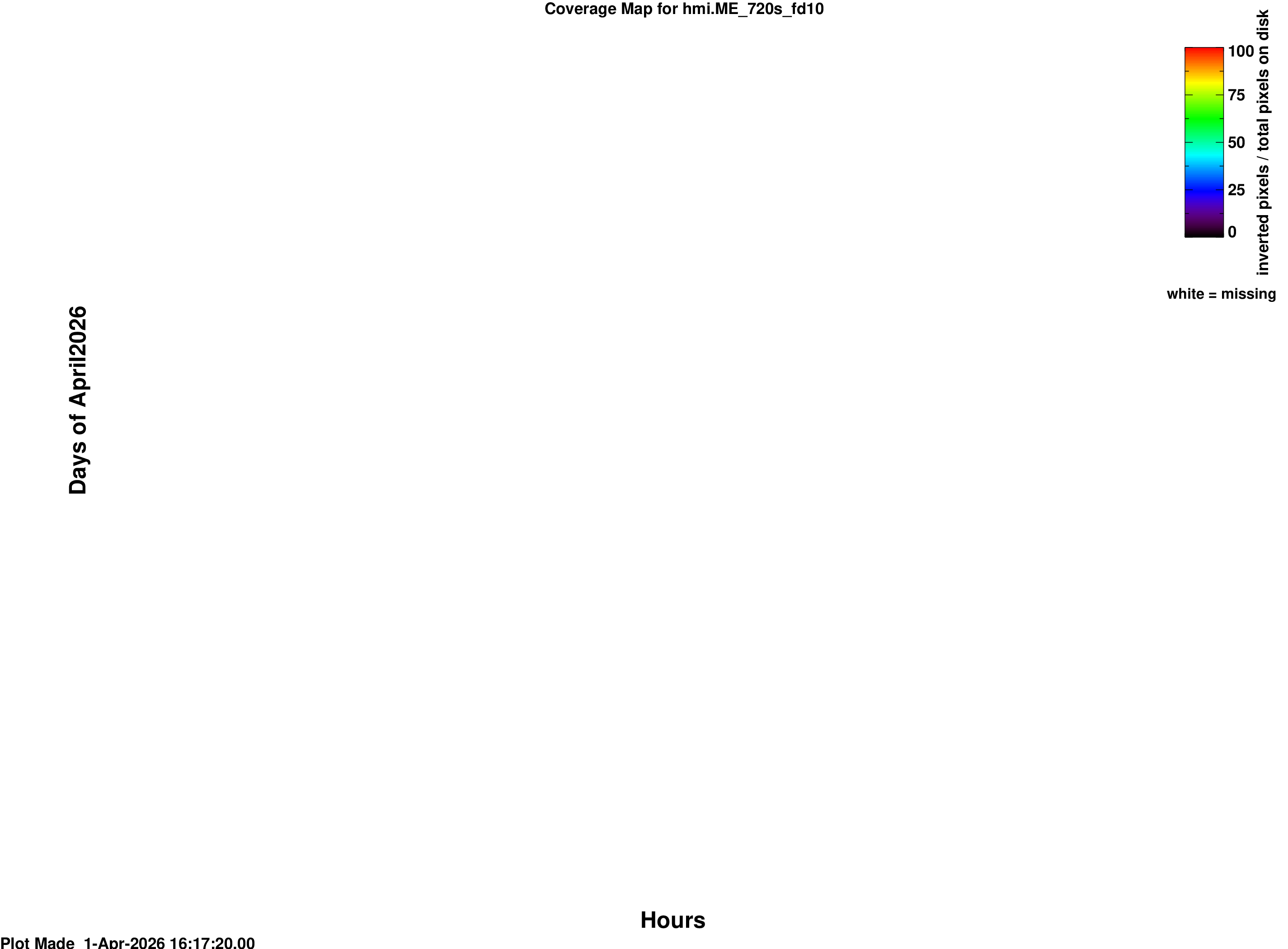 The coverage maps in the /fd10 series are a montage of two maps: The left map shows coverage for hmi.S_720s and follows the color schemes outlined above. For the right map, colored spaces indicate times when inverted data is present; the color of the data correspond to the value of (INVNPROC) / ( PI*(RSUN_OBS*(1/CDELT1))^2 ), or (the number of inverted pixels)/(total number of pixels within the solar radius). Values greater than 1 are truncated to 1. The keywords RSUN_OBS and CDELT1 are obtained from the appropriate time in the hmi.S_720s data. White spaces indicate times where the stokes data are available but the inversion module has not yet been run.