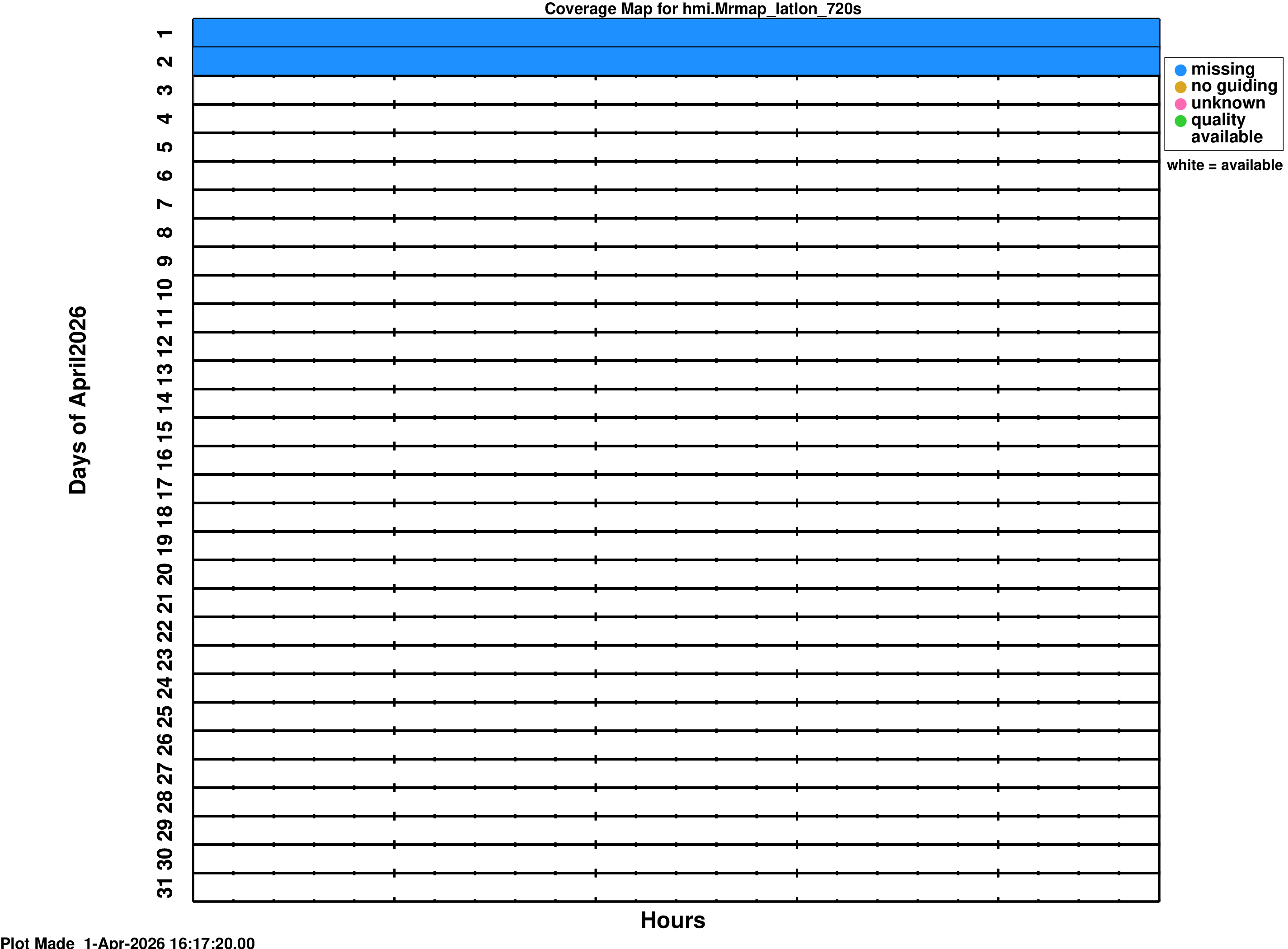 White spaces on the coverage maps indicate time where data is ready for use. The colors on the coverage map indicate times where the data product is not available or has some QUALITY bits set. Colors mean: